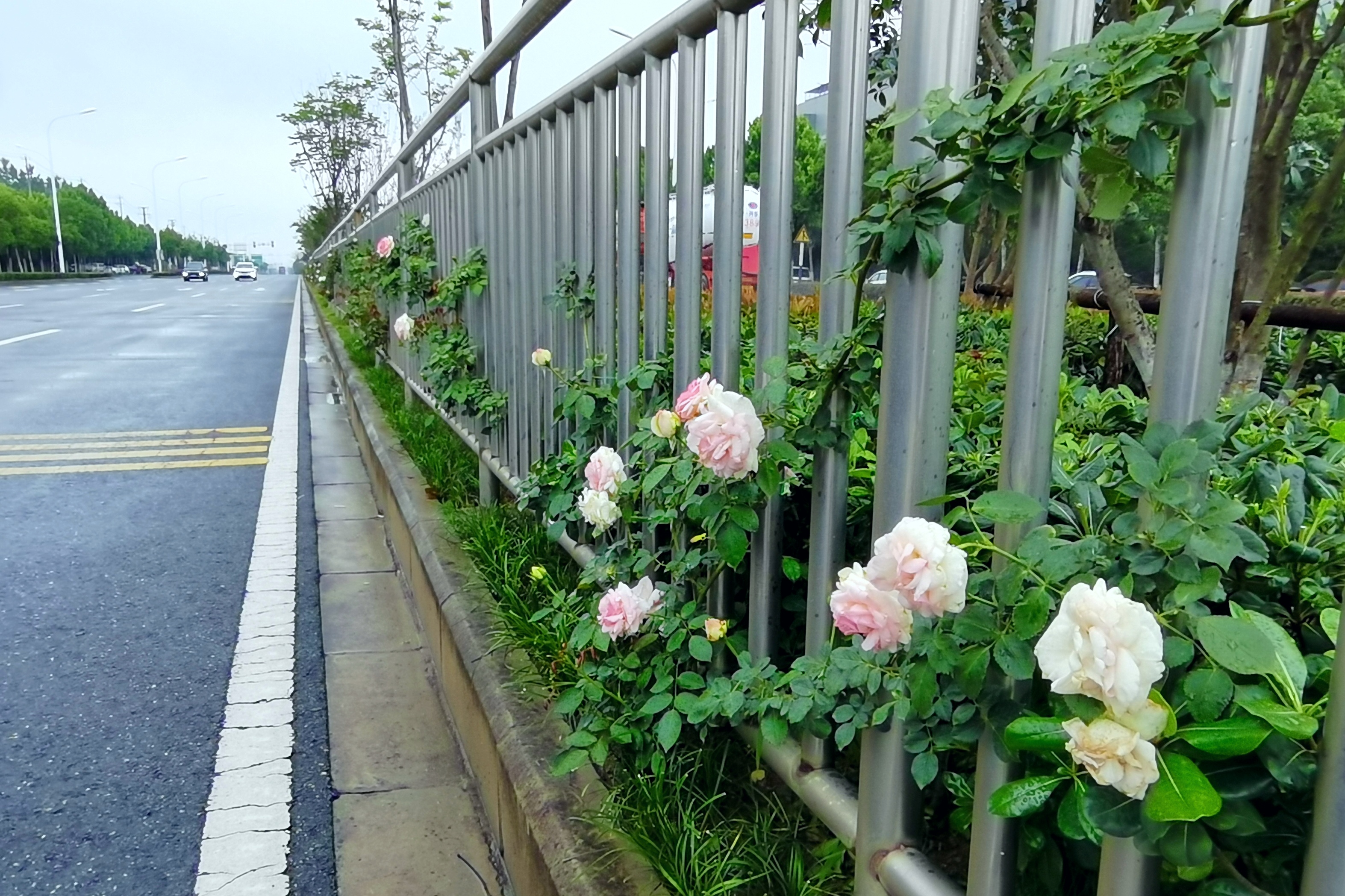 創(chuàng)意提升:根據(jù)現(xiàn)場實際狀況以及后期預(yù)測植物生長狀態(tài),本路段采用多花的粉色月季——“粉龍”。粉龍原產(chǎn)于德國,其特點是花量大,植株高,攀援性強,重瓣淺粉色、淡香,花期5-6月,抗病性強,后期易形成大規(guī)模攀援綠籬景象。